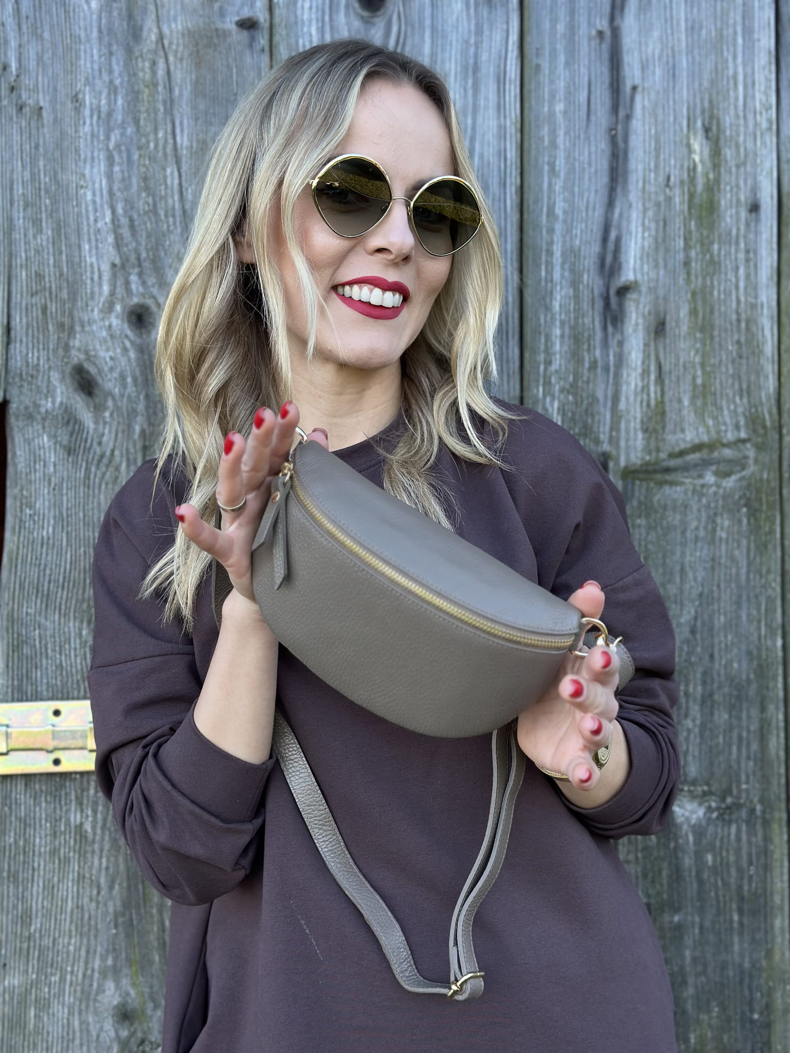 Beżowa skórzana torebka typu nerka